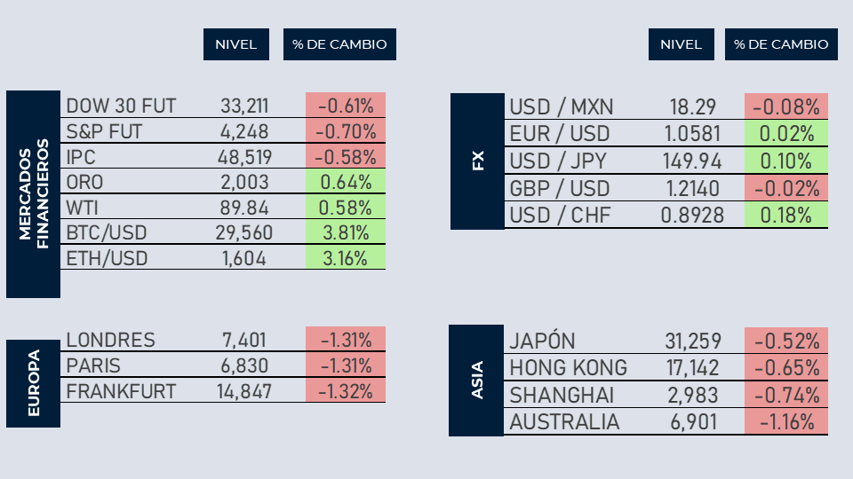 Los mercados americanos amanecen a la baja en la última sesión de una semana con tendencia bajista. En Europa y Asia, la historia es similar y todos los índices pierden terreno. Los inversionistas están asimilando ya los estragos de la guerra en Medio Oriente a medida que esta avanza y amenaza con extenderse mucho más allá de Gaza. En otras noticias, continúa el juicio contra el ex rey de las criptomonedas, Sam Bankman-Fried, la evidencia muestra que FTX aportó cerca de 50 millones de dólares a grupos políticamente activos que no revelan sus donantes.