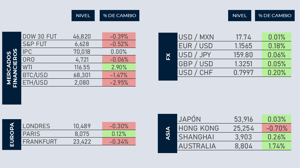 Por otro lado, el mercado se mantiene atento a movimientos corporativos relevantes, como la posible adquisición de Universal Music por parte de Pershing, así como al impulso del sector tecnológico liderado por compañías como Broadcom y Samsung en inteligencia artificial. En México, el enfoque se mantiene en iniciativas para fortalecer la inclusión financiera.