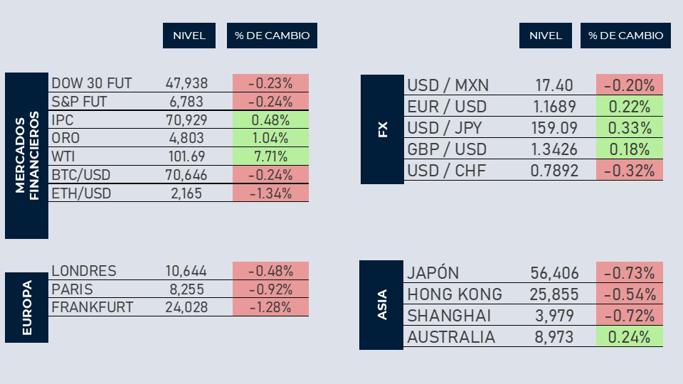 Los principales índices americanos inician ligeramente a la baja la sesión de este jueves, esto luego de la muy buena sesión de ayer donde lograron subir cerca de 1.5%. La atención de los inversionistas continúa centrada en el conflicto de Medio Oriente a pesar del acuerdo del martes. Algunos aliados y funcionarios americanos informan que es pronto para cantar victoria y que sigue habiendo riesgos que pondrían en peligro el alto al fuego y la apertura del estrecho de Ormuz. Israel ha continuado con amenazas de ataque a Beirut y el petróleo regresa por encima de los $100 dólares por barril. En nuestro país, el Senado aprobó cambios a la Ley Federal de Trabajo y envío la propuesta a los Diputados para la revisión.