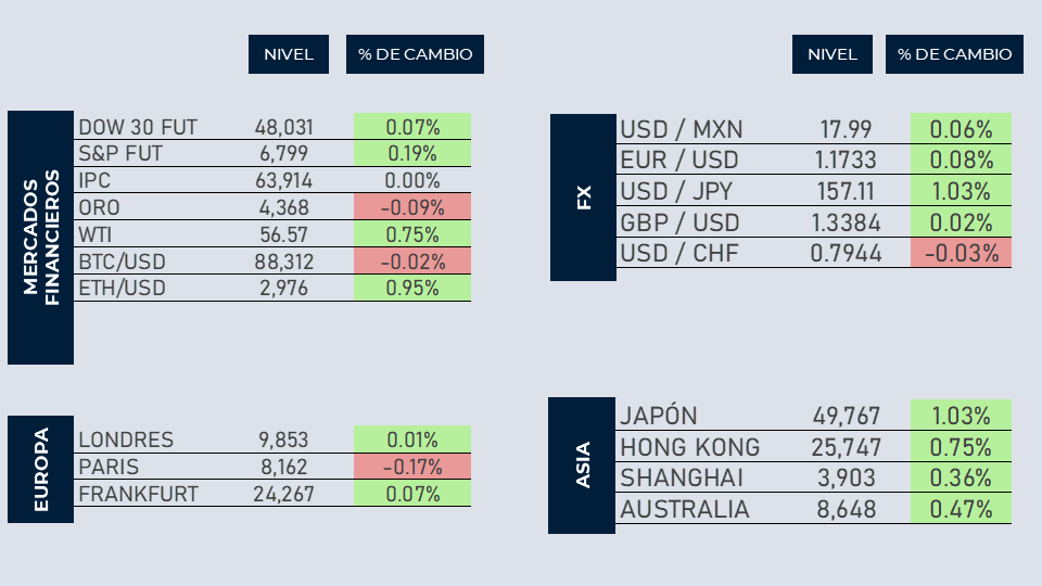 Los mercados americanos apuntan a abrir al alza en una jornada relativamente calmada, cercana a las fiestas decembrinas. En Japón, se dio a conocer un incremento en su tasa de referencia, pasando de 0.50% a 0.75%, un movimiento contrario a la tendencia seguida por otros bancos centrales y que alcanza un máximo histórico. El día de ayer, Banxico anunció una baja en la tasa de interés, a 7.00%, señalando cautela ante el aumento del IEPS, el cual se aplicará de forma más elevada a diversos productos el próximo año, así como por los aranceles a países con los que México no mantiene acuerdos comerciales.