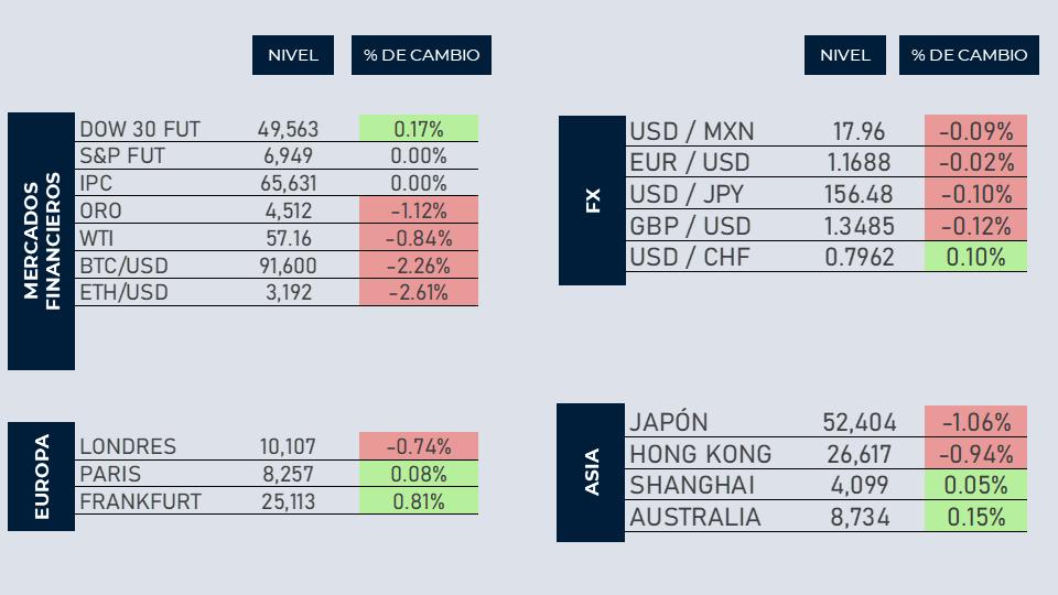Los mercados amanecen con muy pocos cambios tras un escalamiento en las tensiones geopolíticas entre Estados Unidos y Rusia, derivado de la captura de un carguero petrolero ruso en el Atlántico por parte de Estados Unidos, el cual presuntamente se dirigía a Venezuela.