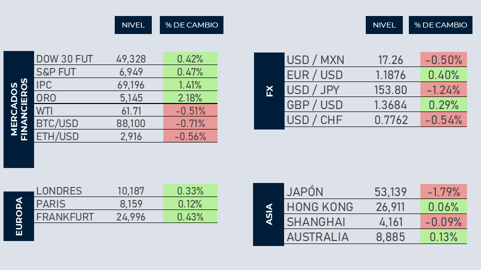 Los índices americanos abren al alza en el inicio de operaciones de una semana importante ya que viene el reporte de resultados de las magnificent 7 . Además, los inversionistas esperan el anuncio de decisión de política monetaria de la Fed el miércoles. Al mismo tiempo, continúa la tensión comercial y Trump amenaza a Canadá con arancel del 100% si hacen algún acuerdo con China. En otras noticias, el dólar cae a su mínimo en cuatro meses y el oro supera los $5,000 dólares a medida que continúa la incertidumbre.