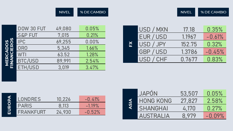 Los mercados estadounidenses amanecen ligeramente al alza, tras darse a conocer despidos en la plantilla laboral de Amazon. Asimismo, el mercado se mantiene a la espera de la decisión de la Reserva Federal respecto a la tasa de interés, la cual los analistas estiman que permanecerá sin cambios. Por último, el precio del oro continúa alcanzando máximos históricos y supera la barrera de los 5,250 dólares por onza.