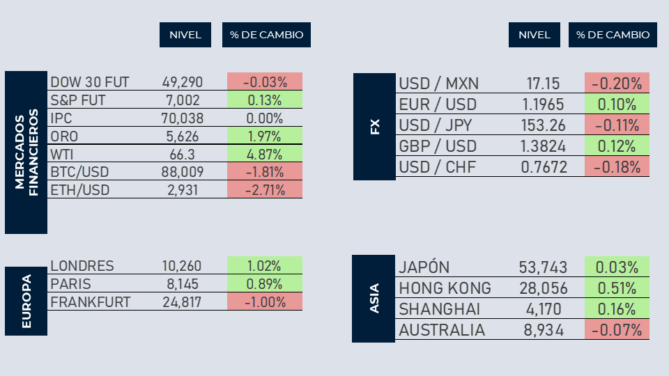 Los principales mercados americanos amanecen ligeramente verdes en el inicio de operaciones de este jueves. La atención de los inversionistas es acaparada por los resultados que tienen a Meta y Tesla ganando terreno y a Microsoft perdiendo casi 6%. Además, el dólar continúa debilitándose y Trump declara que no le preocupa esto, los metales se encuentran en máximos y algunos bancos centrales planean medidas. Asimismo, la Fed decidió dejar sin cambios la tasa de referencia en la reunión de política monetaria del día de ayer. En las noticias nacionales, México y Estados Unidos iniciaron conversaciones formales para introducir posibles cambios estructurales al T-MEC.