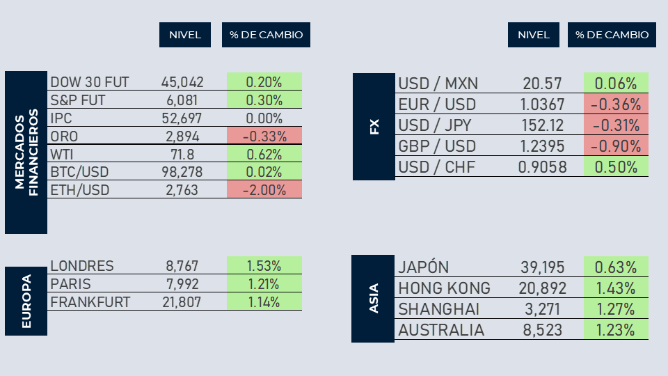 Los principales índices americanos abren al alza la sesión de este jueves. En Europa, los indicadores se encuentran en zona verde, y en Asia están mixtos. Los inversionistas analizan las decisiones de política monetaria, el Banco de Inglaterra baja la tasa y se espera a Banxico más tarde. Además, los legisladores americanos trabajan en una iniciativa para que se prohíba DeepSeek en los dispositivos gubernamentales, esto por el riesgo del manejo de información con la empresa china. Por otro lado, se esperan resultados de Amazon al cierre, los analistas estiman que el gigante tecnológico pasará por primera vez a Walmart en términos de ingreso.
