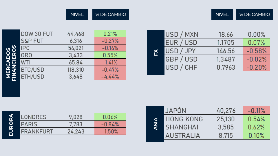 En México, la actividad económica registró una caída durante el mes de mayo, sorpresiva y por debajo de las expectativas del mercado. En contraste, las ventas minoristas se aceleraron en el mismo periodo, mostrando un comportamiento más dinámico del consumo.