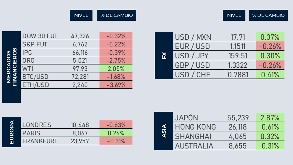 Los mercados estadounidenses apuntan a una apertura a la baja tras datos de inflación al productor por encima de lo esperado, lo que incrementa las preocupaciones sobre presiones inflacionarias, en un entorno ya afectado por el alza en los precios del petróleo. El mercado se mantiene a la expectativa de la decisión de la Reserva Federal, que será clave para definir el rumbo de la política monetaria ante los riesgos derivados del conflicto en Medio Oriente.