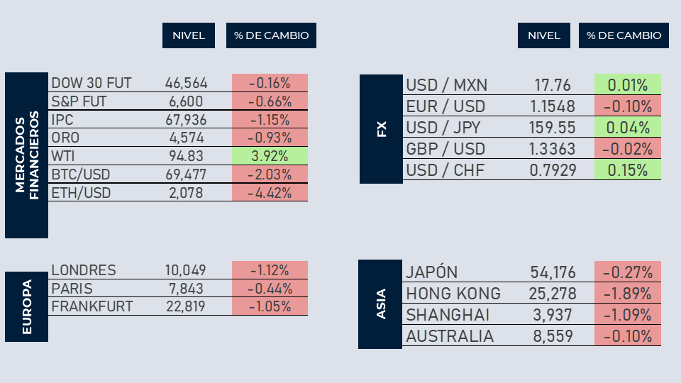 Los mercados americanos abren a la baja y pierden parte del terreno recuperado en las primeras tres sesiones de la semana. En Medio Oriente, continúa la incertidumbre pues Israel afirma haber matado al líder iraní responsable del bloqueo en el estrecho de Ormuz. Trump declaró que Irán debe ponerse serio en las negociaciones para lograr un acuerdo. Además, la OCDE declaró que la inflación americana pudiera llegar a 4.2% por el impacto de la guerra y los bloqueos energéticos que elevan la inflación general. Al mismo tiempo, el petróleo se aproxima a su mayor alza mensual en más de 30 años con incrementos cercanos al 50% en la mayoría de las mezclas.