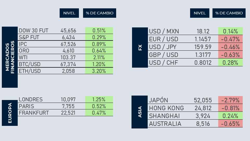 Los principales índices americanos abren al alza en el inicio de operaciones de esta semana. Los mercados buscan recuperar algo de terreno luego de las malas sesiones de cierre de la semana pasada donde los mercados cayeron a niveles no vistos desde agosto del año pasado. Los inversionistas continúan preocupados por las tensiones de Medio Oriente. Trump manifestó el fin de semana que están trabajando en un plan para confiscar el uranio y petróleo de Irán. Además, los costos de financiamiento se disparan en Europa impulsados por el temor a las repercusiones fiscales del conflicto en Irán. Por último, Banxico menciona que están cerca de concluir el ciclo de ajustes en la tasa de interés tras la bajada de la semana pasada.
