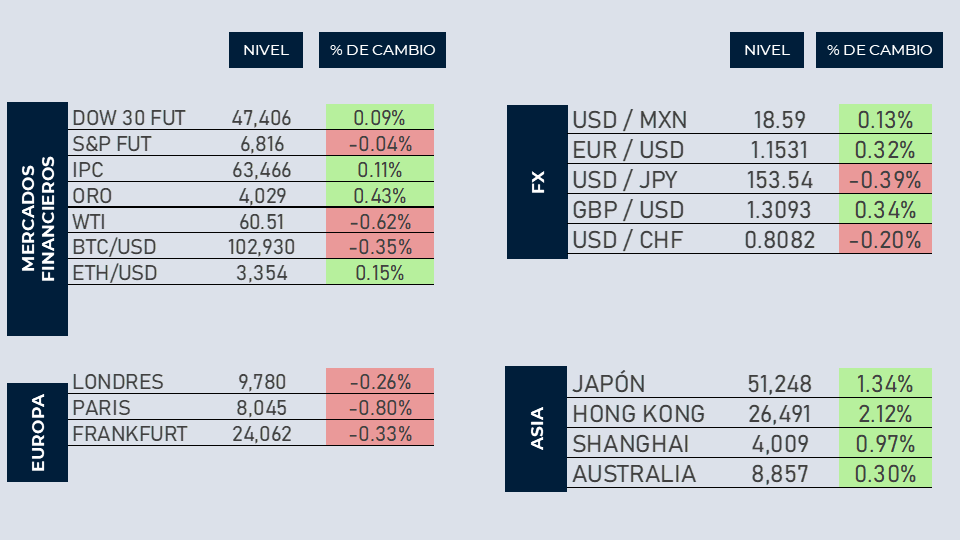 Los mercados en Wall Street inician con poco cambio este jueves tras el rebote tecnológico de la jornada de ayer. Los inversionistas muestran prudencia ante la incertidumbre sobre los próximos pasos de los principales bancos centrales y la posible revisión de aranceles en EE.UU., después de que la Corte Suprema expresó dudas sobre la legalidad de las tarifas impuestas por Donald Trump bajo la Ley de Emergencia Económica. En el mercado de materias primas, el oro prolongó su racha alcista y volvió a superar los $4,000 dólares por onza, mientras los reportes corporativos continúan captando la atención de los operadores. Por último, se espera la decisión de tasa de interés en México, los analistas prevén una bajada de 25 puntos base para dejar la tasa de referencia en 7.25%.