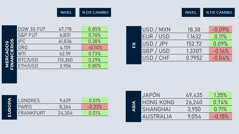 Los mercados estadounidenses abren ligeramente al alza tras conocerse el dato de inflación, el cual se había estado esperando por un largo periodo debido al cierre de gobierno. Dicho dato resultó ligeramente por debajo de lo estimado, lo que indica que la inflación se mantiene controlada dentro de los niveles previstos por la Reserva Federal.